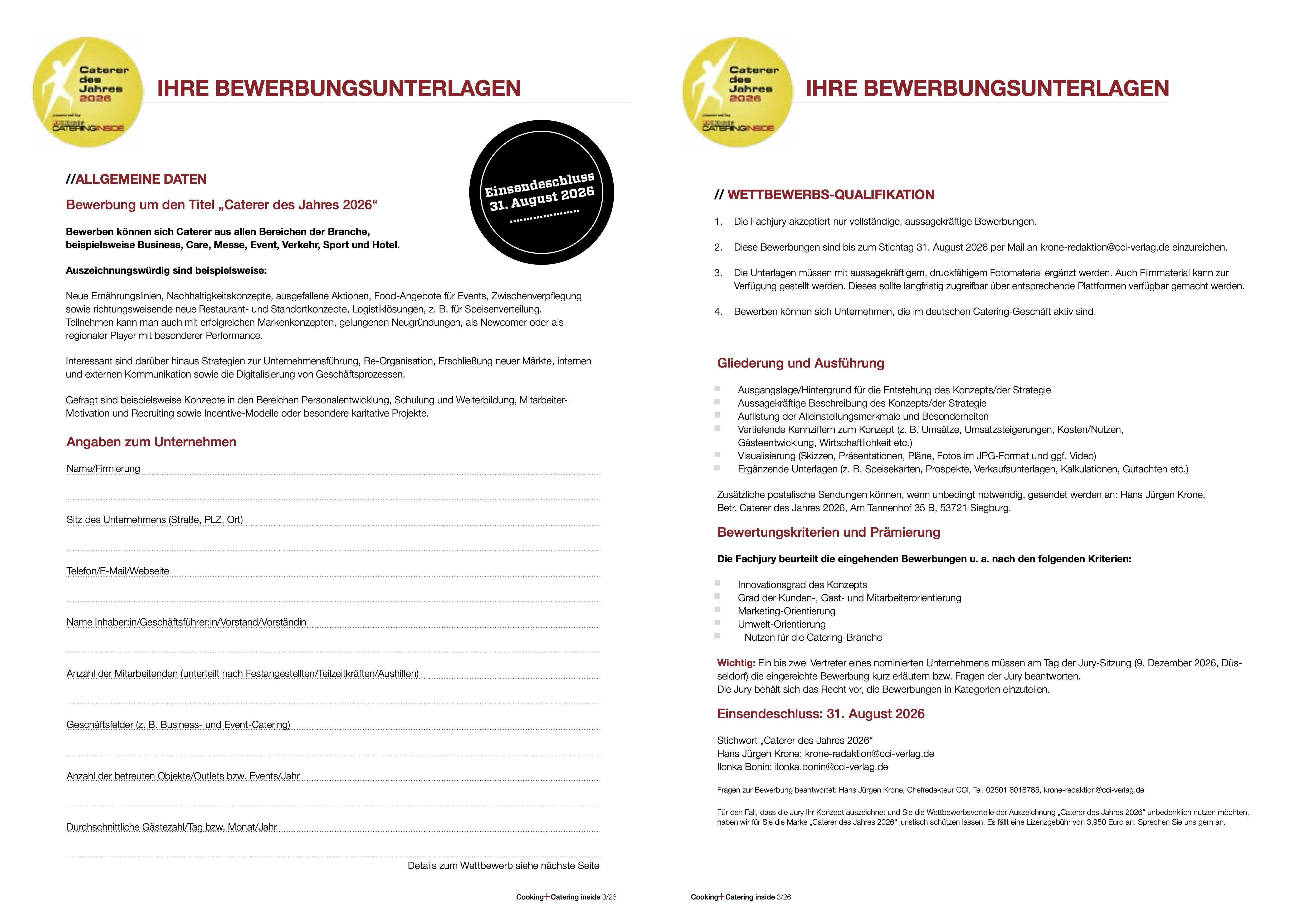 Trotz aller Online-Ambitionen in der Catering-Branche gehen wir, auf Ihren Wunsch hin, bei den Bewerbungen seit zwei Jahren wieder den klassischen Weg: Was in Ihrer Bewerbung enthalten sein muss, finden Sie auf den beiden kommenden Seiten. Diese können Sie uns als pdf zukommen lassen. Dazu können Sie per Mail Material wie Präsentationen, Bilder und andere Informationen liefern. Der diesjährige Bewerbungsschluss ist der 31. August. Aus den Erfahrungen der vergangenen Jahre haben sich darüber hinaus vier weitere Punkte ergeben, die Sie bitte beachten sollten.